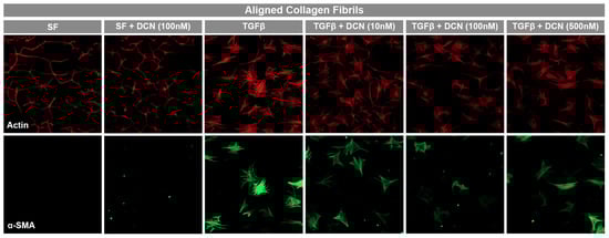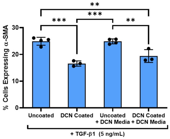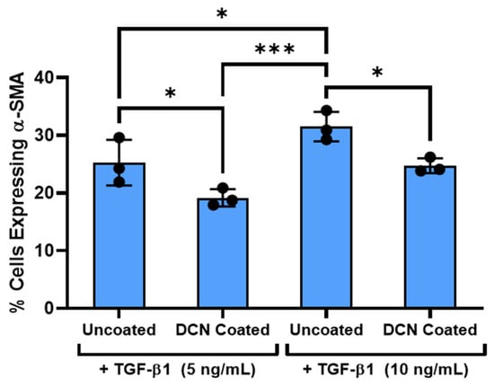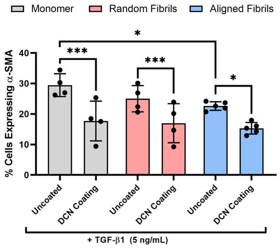 Previous literature has suggested that decorin inhibits the TGF- β1 signaling pathway through its competitive binding to TGF-β1 in solution which reduces the amount of TGF-β1 available for cell receptor binding [,]. Further studies have elaborated on this finding, observing that decorin immobilized on collagen can sequester or inactivate TGF-β1 []. Direct interaction of decorin with cell surface receptors (e.g., PDGFR, EGFR, or LRP-1) has also been reported as a pathway for regulation of growth factor signaling by decorin [,]. To probe the mechanism of TGF-β1 inactivation by the decorin coating on aligned collagen fibrils, we measured the expression of α-SMA on coated and uncoated aligned collagen fibrils with double the concentration of TGF-β1 (10 ng/mL) than used in the previous experiments (5 ng/mL). By doubling the amount of TGF-β1 in the cell culture media, we expected the extra growth factor to overcome the inhibitory effects of the decorin coating due to the sheer number of TGF-β1 molecules (200 pM and 400 pM for 5 ng/mL and 10 ng/mL, respectively) compared to decorin molecules (37.5 pM estimated decorin coated onto aligned collagen fibrils with a 100 nM solution) []. Interestingly, we observed a significant (p < 0.05) decrease in the percent of α-SMA expressing cells on decorin-coated collagen fibrils compared to their uncoated counterparts for both the 5 ng/mL (24% drop) and 10 ng/mL (21% drop) concentrations of TGF-β1 (Figure 7). This result suggests that decorin inhibition of α-SMA expression may be in part independent from TGF-β1 concentration and may be influenced by decorin interactions with cell surface receptors. However, additional experiments are required to determine which cell surface receptors decorin maybe interacting with.