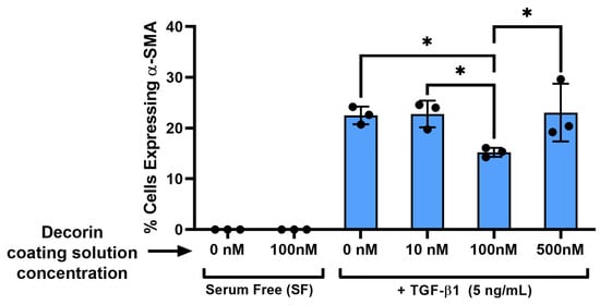 Quantification of α-SMA expression in response to decorin coating concentration. Plot of the mean ± s.d. percentage of cells expressing α-SMA immunofluorescence on the aligned collagen fibrils from 3 experimental replicates. Individual datapoints represent the average percent of cells expressing α-SMA analyzed for each experimental replicate. two-way ANOVA with Tukey’s post hoc test was used to determine significance between experimental groups (* p < 0.05).