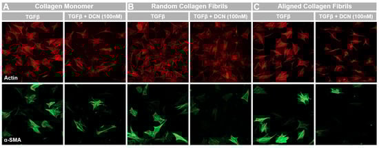 Effects of topography and fibril alignment on decorin coating inhibition of TGF-β1 mediated activation. Representative fluorescent images from 4–5 independent experiments of corneal keratocytes cultured on uncoated and decorin-coated (A) collagen monomers, (B) random collagen fibrils, and (C) aligned collagen fibrils. Red = actin, green = α-SMA Scale Bar = 100 μm.