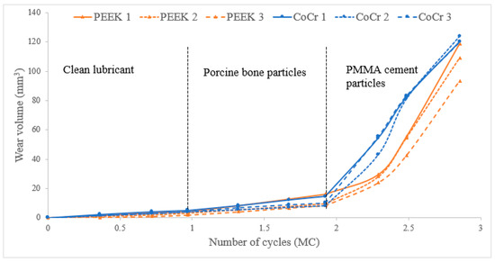 Wear volume of UHMWPE tibial components (mm3) against CoCr and PEEK femoral components during the three phases of the study.