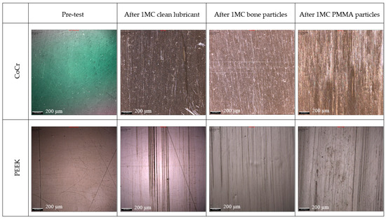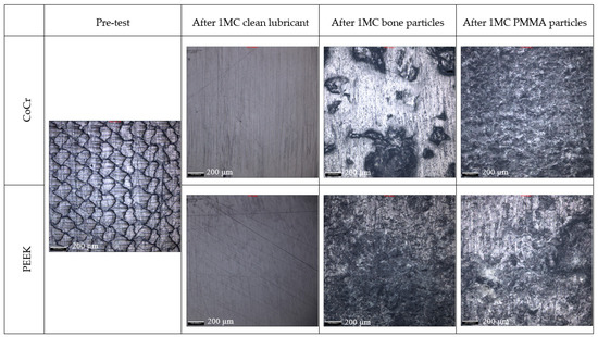 Representative images of UHMWPE tibial components (medial compartment, middle of wear scar) articulating against CoCr and PEEK femoral components taken with 10× magnification using an Alicona G5 optical microscope; scale bar represents 200 µm.