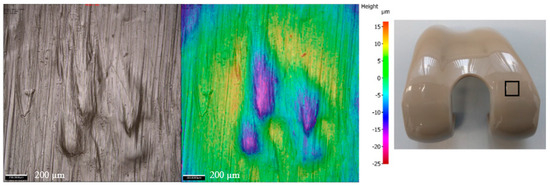 Images of PEEK femoral components taken at 10× magnification using an Alicona G5 optical microscope showing the deformation which occurred at full extension following simulation with porcine bone particles. Scale bar represents 200 µm; the image on the right shows the approximate region in which the images were taken on an unworn implant.