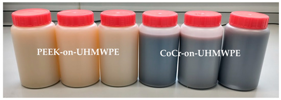 Lubricant samples from the PEEK-on-UMWPE knee (left) and the CoCr-on-UHMWPE knee replacement (right) following 0.3 MC of wear simulation with PMMA cement particles added to the lubricant. Note the discolouration of the lubricant in the CoCr-on-UHMWPE test.