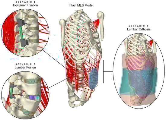 Visualization of the active hybrid FE–MB MLS (musculoskeletal lumbosacral spine) model with scenario overview. The intact MLS model [] was modified to replicate three treatment scenarios involving medical devices. The procedures can be categorized into surgical treatment in the form of lumbar spinal instrumentation (scenarios 1 and 2) and conservative treatment with an orthosis (scenario 3). For better visibility, the muscles on the right side of the body are hidden in scenarios 1 and 2, and the L4/5 annulus fibrosus is shown in sectional view in scenario 2.