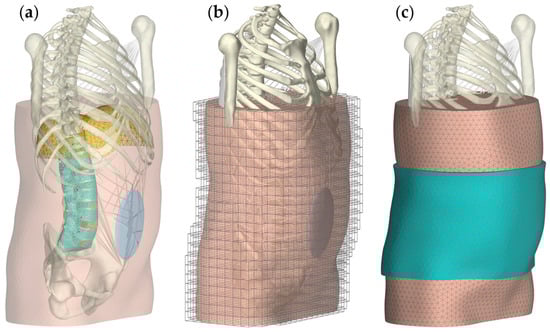 Two examples of medical devices used to stabilize the spine are lumbar orthoses for conservative treatment [,,,] and spinal implants for surgical treatment [,]. The latter include screws and rods, interbody cages, and plates that are implanted for the direct fixation and fusion of the spine [,,,]. A lumbar orthosis, on the other hand, is an external device that encompasses all or part of the lumbar and sacroiliac regions of the trunk and is used to modify the structural and functional characteristics of the neuromuscular and skeletal systems [,]. To support the engineering design process [] and predict the treatment outcomes of new devices, biomechanical studies are conducted []. These provide essential quantitative measures to ensure that the design process is not based solely on expert opinion rather than by biomechanical data and clinical evidence []. However, even the latest experimental methods used to study spinal mechanics and the loads and effects of medical devices have their limitations []. As a result, virtual models are increasingly being used, with varying levels of detail and solution approaches [,,]. These models are intended to describe the existing knowledge of the complex physiology and pathology of the human body using mathematical models in order to derive useful predictions for treatment as a quantitative hypothesis [].