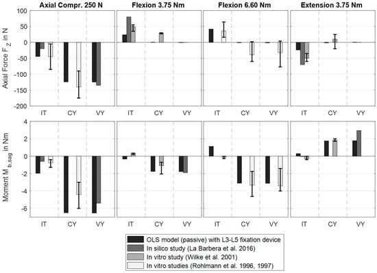 Excerpt from the simulated internal loads in the right rod of the posterior lumbar spinal fixation device (scenario 1) under pure axial compression force or pure bending moment. For validation, the simulation results were compared with in vitro measurements by Rohlmann et al. [,] and Wilke et al. [], and in silico data by La Barbera et al. []. Only available comparison data were visualized. The fixators bridged vertebra L4 in three different clinical scenarios (cf. Figure 2a): Intact spine (IT), after corpectomy (CY), and after vertebrectomy (VY).
