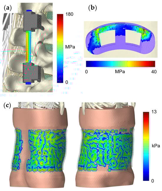 Exemplary visualizations of predicted stress and pressure distributions for the three scenarios: (a) Von Mises stress in the right rod of the fixation device in posterolateral view with the thorax in 30° flexion. Muscles on the right side are hidden. The almost stress-free sections of the rod adjacent to the clamps resulted from the attachment conditions of the rod elements. (b) Pressure distribution on the cranial side of the interbody cage with the thorax in 30° flexion. All components except the cage were hidden cranial to vertebra L5. (c) Pressure distribution under the orthosis applied with maximum tension in relaxed standing position, shown in posterolateral (left) and anterolateral (right) view. The pressure is not interpolated, and the orthosis is displayed transparently.