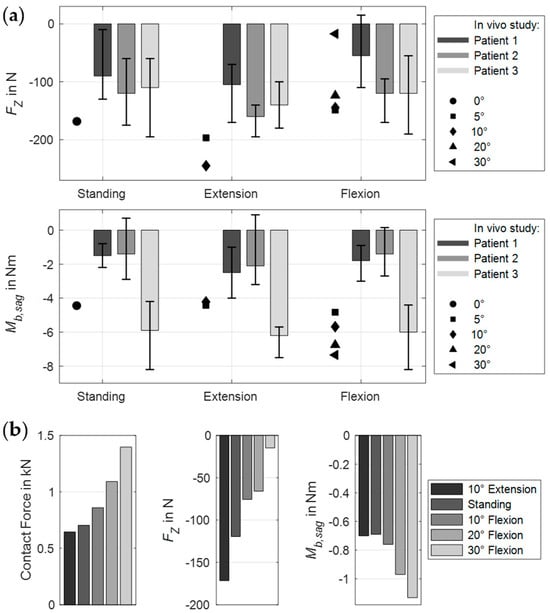 The body postures and resulting muscle activation patterns of the MLS model strongly influenced the internal loads on the PF (Figure 7a). The predicted results compared to in vivo data [] are visualized in Figure 8a. The forces and moments measured by Rohlmann et al. varied considerably between the three patients. Our results fell almost completely within these ranges and varied depending on different thorax extension and flexion angles. The maximum axial force in a rod was −245 N in 10° extension and the minimum was −12.4 N in 30° flexion. In the latter case, we also measured the maximum bending moment of −7.4 Nm. Thus, the axial forces in extension exceeded the forces measured in vivo. All relative changes due to postural changes were plausible. However, it should be noted that neither the exact postures nor the equivalent spinal conditions of the participants could be replicated in our study.
