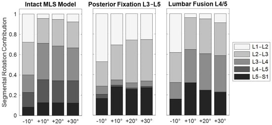Summary of the segmental rotation contributions of the motion segments L1–L2 to L5–S1 in sagittal plane. The rotation contributions are given for the five postures 10° extension (−10°) to 30° flexion (+30°) for the intact MLS model and the two scenarios with spinal instrumentations. All values are given in relation to the respective upright posture (end of phase [iii]).