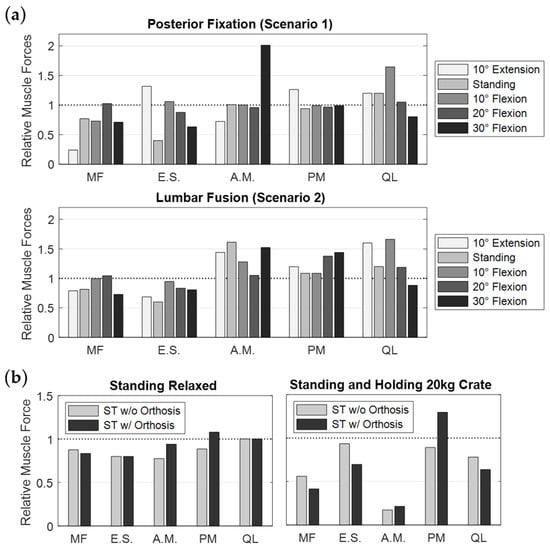 Predicted muscle forces given as the ratio of the modified to the intact MLS model in the same posture. Forces of iliocostalis thoracis, iliocostalis lumborum, and longissimus lumborum are combined into erector spinae (E.S.) and internus abdominis, obliquus externus abdominis, and rectus abdominis are combined into abdominal muscles (A.M.). Further individual muscle fibers were summed for multifidus (MF), psoas major (PM), and quadratus lumborum (QL). Scenarios are the spinal instrumentations (a) and the extension with soft tissues (ST) with (w/ orthosis) and without (w/o orthosis) lumbar orthosis (b).