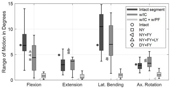 The calculated ROMs of the validation load cases for the lumbar fusion are visualized in Figure 12 for a comparison with in vitro study data []. For flexion and axial rotation, the deviations from their median values were minimal in the intact state. In extension, our motion segment overestimated and in lateral bending it underestimated the in vitro movements. These deviations were absent compared to the in vitro study [] used to validate the OLS model []. As can be seen in Figure 12, these systematic deviations also remained after the implantation of the interbody cage. On the other hand, relative ROM changes with and without the cage were consistent with the in vitro data in all spatial directions. Overall, cage implantation altered the ROMs to between −31% and +21% of the intact movement. The height expansion of the cage increased the disc space by approximately 1 mm, ensured a press fit, and pre-tensioned the structures of the motion segment. This was 6% of the mean disc height, which corresponds closely to previous studies [,,] and was found to mimic the validation results best. The tight annulus fibrosus had the greatest influence on mechanical behavior and stability. For the setups w/IC (NY + FY) and w/IC (DY + FY), distraction resulted in contact forces of 250 N and 120 N on the anterior side of the cage, respectively. Regardless of the validation setup examined, the additional implantation of the PF reduced the ROMs to almost 0° and the stiffness of the lumbar fusion (w/IC + w/PF) was at the upper end of the study data.
