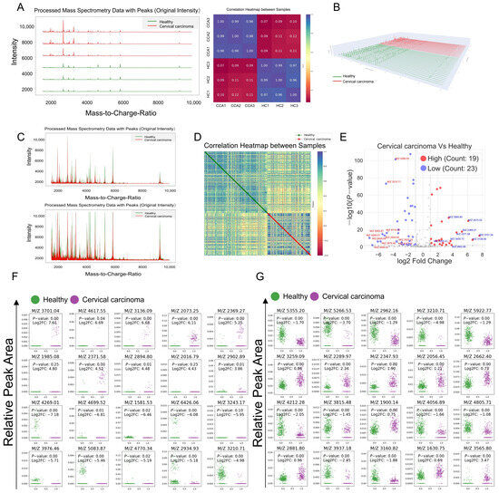 Mass spectrometry data processing and the screening of differential peptides. (A) LC-MS identification of peptide profiles and Pearson coefficients within the 1000–10,000 KDa range. (B) 3D fitting image of differential peptide peaks. (C) Top: Overlaid mass spectrum peaks after fitting of raw time-of-flight mass spectrometry data; Bottom: Normalized overlaid mass spectrum peaks of all samples. (D) Correlation analysis between samples, green: healthy samples, red: cervical cancer samples. (E) Volcano plot of differential serum peptides between the cervical cancer patients and healthy donors, red: upregulated, blue: downregulated. (F) Top 20 peptides with the largest expression differences (log2FC). (G) Top 20 peptides with the largest statistical differences (p value).