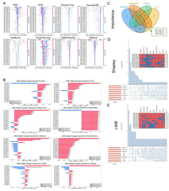Feature selection in different machine learning models. (A,B) High-performing differential peptides identified based on feature value extraction using different machine learning algorithms. (C) Feature importance values extracted and cross-validated by the decision tree, random forest, LGBM, and XGBoost classifiers. (D) Shapley and (E) LIME analysis for different machine learning algorithms.
