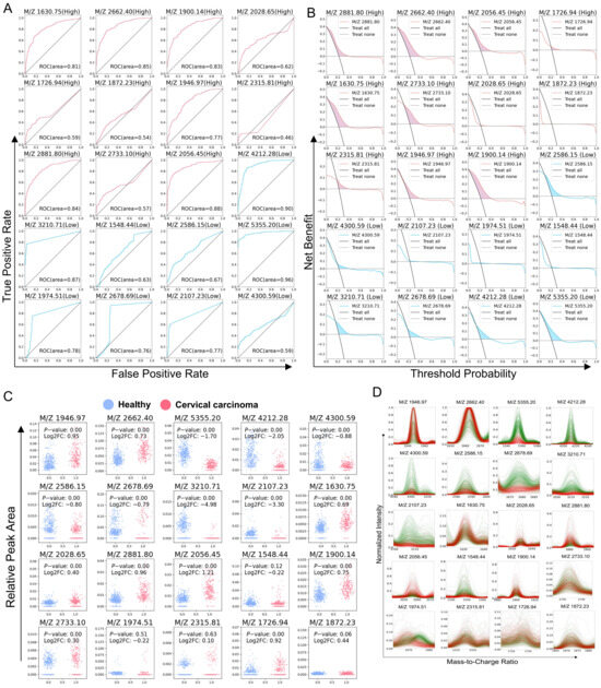 To further evaluate the clinical significance of the identified features that demonstrated significant discriminatory power across different models in cervical cancer, we first generated ROC curves for each feature individually. The results revealed varying areas under the curve (AUC) for different feature indicators (Figure 4A) including M/Z = 2056.45 (AUC = 0.88), M/Z = 1630.75 (AUC = 0.81), M/Z = 2881.80 (AUC = 0.84), M/Z = 2662.40 (AUC = 0.85), M/Z = 3210.71 (AUC = 0.87), M/Z = 5355.20 (AUC = 0.96), and M/Z = 4212.28 (AUC = 0.90). Decision curve analysis (DCA) was subsequently performed for each feature, and the corresponding curves were plotted (Figure 4B). By comparing the model prediction curves of each feature with the reference lines (including “treat-none” and “treat-all”) as shaded areas, the net benefit values of each feature as diagnostic indicators were determined. The analysis revealed statistically significant differences in the expression levels of the selected peptides such as M/Z = 2056.45, M/Z = 5355.20, M/Z = 3210.71, M/Z = 1900.14, and M/Z = 2881.80 (Figure 4C). Additionally, the normalized mass spectrometry peak plots of these features were presented (Figure 4D).
