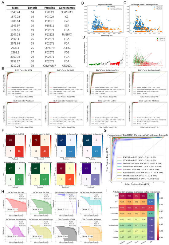 Identification of differential peptides and an evaluation of their diagnostic efficacy. (A) The corresponding genes of peptide peaks that differed significantly based on the UniProt database. (B) Original clustering, (C) bisecting K-means clustering, and (D) BIRCH clustering of the aforementioned differential genes. (E) ROC curves and AUC values of the differential genes under different machine learning algorithms. The shaded bands indicate the performance metric variability across cross-validation folds, highlighting model stability. (F) Confusion matrices under different clustering methods. The confusion matrix categorizes classification results: true positives (TP, top-left) and true negatives (TN, bottom-right) reflect correct predictions, while false positives (FP) and false negatives (FN) capture errors on the off-diagonal. (G) ROC curves and their association with TPR and FPR, (H) DCA curves, shaded areas indicate the net benefit confidence intervals across clinical thresholds. (I) Performance metrics including the accuracy, precision, recall, and F1 score of the differential genes under different machine learning algorithms.