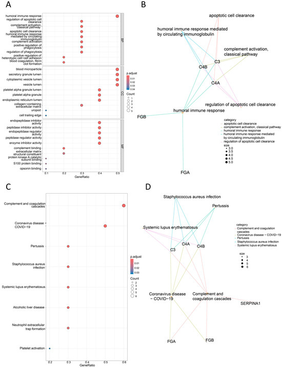 Gene Ontology (GO) and Kyoto Encyclopedia of Genes and Genomes (KEGG) functional analyses were performed on the 10 differentially identified genes using the R programming language, and clustering network graphs were generated. The GO analysis revealed that these genes are potentially involved in biological processes (BP) such as the humoral immune response, regulation of apoptotic cell clearance, complement activation, and regulation of phagocytosis. Additionally, they are associated with cellular components (CCs) including blood microparticles, secretory granule lumen, and cytoplasmic vesicle lumen as well as molecular functions (MFs) such as peptidase inhibitor activity, complement binding, and enzyme inhibitor activity (Figure 6A,B). The KEGG pathway analysis suggested that these genes may participate in disease-related pathways including complement and coagulation cascades, coronavirus disease, pertussis, Staphylococcus aureus infection, and alcoholic liver disease (Figure 6C,D). These analyses provide insights into the molecular activities, cellular localization, biological processes, and potential disease pathways associated with the differentially expressed peptides. Furthermore, protein expression data for these signature peptides were obtained from the PRIDE database. Cervical cancer data were extracted based on tumor classification, and ROC curves and DAC values were generated to validate the expression of individual proteins in cervical cancer (Figure 7).