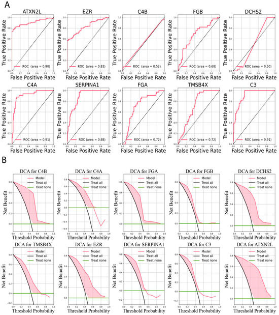 Analysis of the clinical indicators of the identified proteins. (A) ROC curve of single identified proteins. (B) DCA curve of single identified proteins and its evaluation against the reference line.