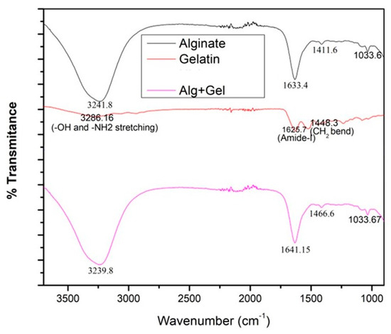 The FTIR spectra graph (Figure 1) shows the three different materials analyzed by FTIR spectrophotometry to confirm the composition. The top line, black, shows the peaks corresponding to the functional groups of alginates at 3241 cm−1 and 1633 cm−1. The next line, red, shows the peaks corresponding to the functional groups of gelatins at 3266 cm−1 for CH2 and -OH stretching and 1625 cm−1 for amide stretching. The bottom pink line corresponds to 8% alginate/6% gelatin hydrogel. We found that peaks around 3239 cm−1 and 1641 cm−1 confirmed the presence of both gelatin and alginate in the gel.