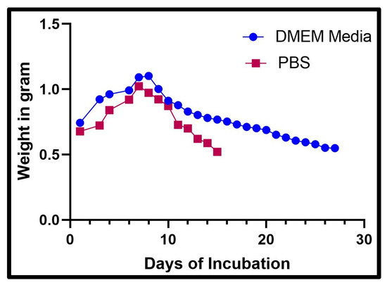 The swelling and degradation experiments were concluded when the scaffold was too fragile to remove from the solutions. The data were graphed in terms of the weight of the scaffold in grams over days. The incubation period for the scaffold in DMEM (Figure 2) was 27 days, but the incubation period in PBS (Figure 2) was 15 days. There was a trend in both DMEM and PBS where the weight increased to 7 and 8 days and then decreased as degradation took place. The scaffolds in DMEM held their structure longer than the scaffolds in PBS, and the weight settled at about 0.549 g. The weight of the scaffold in PBS after 15 days was not recorded as the scaffold degraded. We found promising results where the scaffolds in DMEM retained their structure longer than the scaffolds in PBS. This result means that an 8% alginate/6% gelatin scaffold could be compatible with DMEM, which was used for the culture of cells, and the swelling results also demonstrated that gel was able to absorb media inside, which may help the cells to survive if cells grow inside the gel.