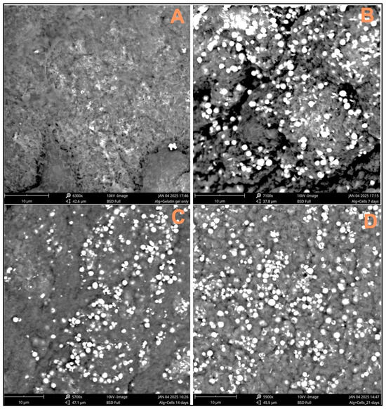 SEM images taken to confirm the presence of cells on the scaffold surface: (A) 8% alginate/6% gelatin printed scaffold alone, (B) scaffold containing 7-day-cultured Fibroblast and HaCaT cells, (C) scaffold containing 14-day-cultured Fibroblast and HaCaT cells, and (D) scaffold containing 21-day-cultured Fibroblast and HaCaT cells.