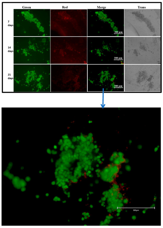 For the live/dead fluorescence staining study, cells at the rate of 1 × 106 cells per scaffolds (20 × 20 × 1 mm) were seeded for 7, 14, and 21 days. Every alternate day, the medium was replaced with fresh medium. After completion of the incubation period, scaffolds containing cells were stained using the Invitrogen live/dead imaging kit to measure cell viability. The dye mixture (20 μL) was added on each scaffold containing cells and incubated for 15 min. After incubation, images were captured, using the Invitrogen EVOS M5000 imaging system, from Thermo-fisher Scientific (USA), in which the green color indicates live cells and the red color indicates dead cells.