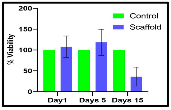 The MTT assay was performed to determine the percentage of viable cells after cultured for 1, 5, and 15 days on scaffolds and in the cell culture plate. Three-dimensional-printed scaffolds were prepared for the MTT assay, as described in the Material and Methods Section 2.8. After the completion of the incubation period, both cells cultured in the well plate and on scaffolds were subjected to MTT dye treatment. Our finding suggested that cells cultured on scaffolds for 1 and 5 days showed similar viability compared to cells cultured in the well plate (Figure 5). However, decreased viability was found in the case of cells cultured on scaffolds for 15 days as compared to the cells cultured in the cell culture plate.