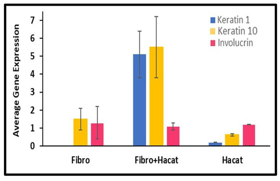 Average gene expression for Keratin 1, Keratin 10, and Involucrin as compared to the reference gene GAPDH. Fibroblast and HaCaT cells grown individually on a cell culture plate were used as a control for the Fibroblasts and HaCaT cells grown on a scaffold.