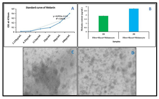 Melanin content quantification in 2D and 3D cultures. Cells were co-cultured in a cell culture plate and on a 3D scaffold for 21 days. (A) Standard curve for melanin content analysis. (B) Graph represents the melanin content in 2D and 3D cultures. (C) Images were captured after 21 days. Co-cultured cells in well plate (2D). (D) Images were captured after 21 days. Co-cultured cells on scaffold (3D).