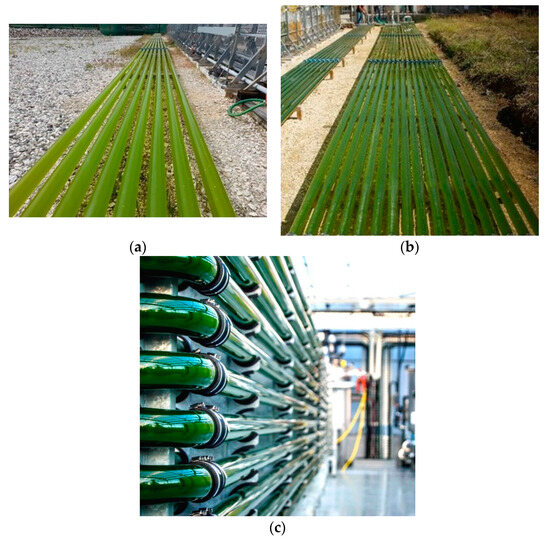 Cultivations were done in three different bioreactor configurations, named U1, U2, and M1. The U1 and U2 reactors were unilayer horizontal tubular photobioreactors (UHT-PBR), with the U1 reactor having 8 lines of tubes and the U2 reactor with 16 lines of tubes; they were exposed directly to sunlight. The M1 reactor was a multilayer horizontal tubular photobioreactor (MHT-PBR) with 24 lines of tubes stacked in two columns of 12 lines of tubes each; it was placed inside a greenhouse and thus was not exposed directly to sunlight. The continuous recirculation velocity of the culture inside the tubes was between 0.7 and 1 m/s. A photograph of the three reactor types can be found in Figure 1.