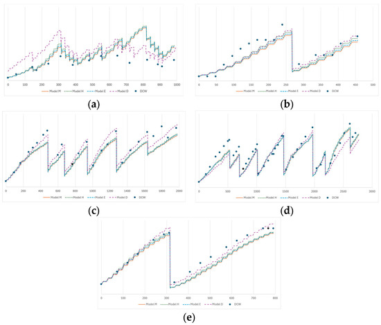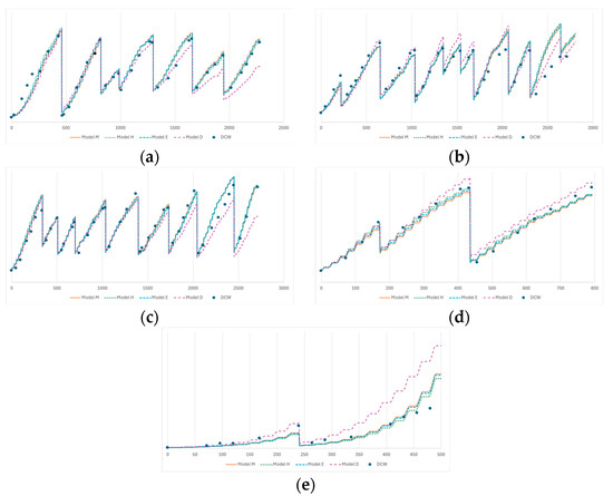 Results of the fitting of the models to the five training assays. The dots are the measured dry cell weights for each assay. The dashed lines are the fitted models. The x-axis is the time since inoculation (in hours); the y-axis is the biomass concentration (in kg m−3). (a) M1-2; (b) M1-4; (c) U1-1; (d) U1-2; and (e) U2-2.