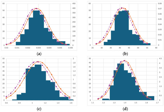 Histograms and the normal distribution for all the fitting parameters of Model H. The dashed lines correspond to the normal distribution when the median is taken as the mean value in the normal distribution. (a) µmax. (b) KI. (c) γ. (d) α.