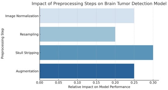 In Figure 4, skull stripping has the highest impact (0.30) as it ensures that the model focuses only on brain tissues, removing unnecessary information that could introduce noise. Augmentation contributes significantly (0.25) by improving model generalization and reducing overfitting to specific patterns. Image normalization (0.25) ensures consistency in intensity scales, making it essential for reducing variability across different imaging modalities. Resampling (0.20) plays a crucial role in standardizing voxel sizes, enabling the model to learn scale-invariant features.