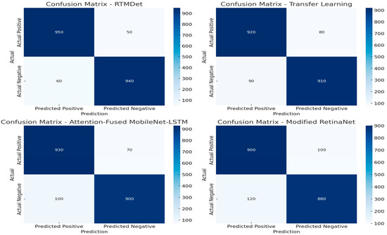The confusion matrix for the top-performing models: RTMDet, transfer learning, Attention-Fused MobileNet-LSTM, and Modified RetinaNet. These heatmaps visualize the classification performance of each model in terms of true positives (TPs), false negatives (FNs), false positives (FPs), and true negatives (TNs).