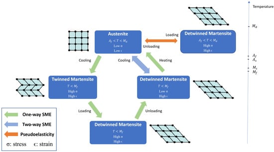 The shape memory effect (SME) is the phenomenon whereby a material is given a temporary shape to recover its original shape on being externally stimulated. The SME was first discovered in 1932 in the Gold–Cadmium (Au-Cd) alloy [23]. Buehler and Wang are credited with the discovery of SME behavior in the famous alloy of Nickel and Titanium that they named ‘Nitinol’ (Nickel–Titanium Naval Ordinance Labs) after the laboratory for which they worked. Nitinol is the most studied and popular [24,25] alloy showing the SME due to its higher stability and thermomechanical performance [26]. The metallic alloys that demonstrate SME behavior are called Shape Memory Alloys (SMAs). The SME in these alloys occurs by a reversible phase transition upon variation in temperature. In this phase transition process, the SMA possesses three different crystalline structures at each stage, twinned martensite, detwinned martensite, and austenite [27]. In a one-way shape memory process (OWSMP), the SMA starts as twinned martensite at a low temperature, which transforms into detwinned martensite with deformation upon mechanical loading. When heated to the austenite start temperature (), it begins to transform to the austenite phase (recovering its original shape). The transformation is completed at the austenite finish temperature (). During this process, the nitinol wire is able to contract to a maximum of 4.5% of its length with Poisson’s ratio 0.33 [28]. Upon cooling to the martensite start temperature (), the SMA starts to return to the twinned martensite phase. The phase transformation is complete at the martensite finish temperature (). The maximum temperature at which martensite can be stress-induced is [29]. After , the SMA deforms permanently, like any other metal [24]. In the two-way shape memory process (TWSMP), the SMA remembers its shape at both high and low temperatures. Such SMAs are not commercially viable as they require training and can recover only half the strain compared to the OWSMP for the same material [30,31,32], and this strain tends to deteriorate rapidly, particularly at higher temperatures [33]. Therefore, OWSMP is a more economical and reliable solution. Numerous training methods have been proposed, two of which are external and spontaneous load-assisted induction. The conductive SMA is usually transformed through the Joule Heating Effect (passing a current through an electrical conductor to produce thermal energy) [28]. Pseudoelasticity (PE) or superelasticity (SE) is the phenomenon where upon the application of a mechanical load at a temperature between and , the SMA reverts to its original shape without thermal activation [34]. Figure 2 shows the shape memory transformation process.