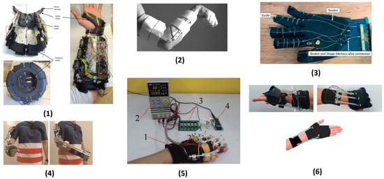 (1) Forearm and hand rehabilitation exoskeleton with 3 DOF [97], (2) EDGES SMA-based actuator [98], (3) Advanced Service Laboratories (ASR) glove for hand rehabilitation [99], (4) Bowden cable-based SMA actuator [100], (5) four-bar link mechanism-based SMA finger actuator: 1. Hand exoskeleton, 2. Constant current source, 3. Drive circuit, 4. Control circuit [101], (6) tube-encased SMA coil wrist actuator [102].