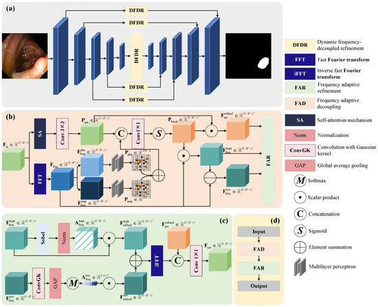 - DFDRNet incorporates DFDR modules at multiple levels of the encoder–decoder structure, allowing for progressive refinement of spatial and frequency-domain features across scales. This hierarchical design enhances the network’s ability to capture fine-grained polyp details while preserving global structural coherence.