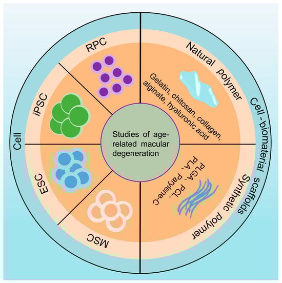 AMD occurs as a result of a multifactorial (genetic, environmental, metabolic, and functional) combination of factors, and the pathogenesis is complex, but the underlying pathology is not well understood []. Current therapeutic modalities encompass pharmacologic agents (e.g., anti-VEGF biologics), gene therapies, and cell-based regenerative strategies. Table 1 summarizes recent advances in the three aforementioned therapeutic approaches. Among these, intravitreal anti-VEGF biologics have revolutionized the management of neovascular AMD, constituting the first-line standard of care in clinical practice []. Antibody studies targeting complement pathway inhibition are still ongoing, and there have been clinical trials demonstrating that avacincaptad pegol, a targeted complement C5 inhibitor, significantly reduced the progression of GA secondary to AMD, with rigorous assessment of both efficacy and safety endpoints []. Pegcetacoplan, a targeted complement C3 inhibitor, has emerged as the first FDA-approved therapy (2023) for GA secondary to AMD. Phase 3 clinical trial data demonstrated its capacity to significantly reduce the rate of lesion growth by 22–29% compared to sham treatment (p < 0.01), with a safety profile characterized primarily by mild-to-moderate ocular adverse events, including conjunctival hemorrhage in 13–20% of participants []. A recent phase I clinical trial published in The Lancet investigated the use of RGX-314 (now referred to as ABBV-RGX-314) for the treatment of nAMD. ABBV-RGX-314 is an adeno-associated virus serotype 8 vector that expresses an anti-VEGF-A antigen-binding fragment and has the potential for sustained VEGF-A inhibition following a single subretinal injection. The results indicated that subretinal delivery of ABBV-RGX-314 was generally well-tolerated, with no clinically significant immune responses observed. This therapy offers a novel approach for sustained VEGF-A inhibition in nAMD patients, with the potential to control exudation, maintain vision, and reduce the treatment burden after a single administration []. Heier and colleagues conducted a phase I clinical trial of JNJ-81201887 (JNJ-1887) gene therapy for AMD, administering a single intravitreal injection to treat GA secondary to dry AMD. The results demonstrated that JNJ-1887 exhibited favorable safety and tolerability in patients with GA secondary to dry AMD. Notably, in the high-dose cohort, the growth rate of GA lesions significantly decreased over 24 months, suggesting that this gene therapy may have the potential to slow the progression of GA. Further investigation is warranted to confirm the long-term efficacy and safety of JNJ-1887 in treating GA []. However, both antibody-based and gene therapies are intrinsically limited by their inability to restore the regenerative capacity of RPE. In contrast, cell-based and cell-biomaterials scaffold-based approaches focus on replacing degenerated RPE cells to stabilize long-term therapeutic outcomes in AMD. Consequently, the following content of this review will prioritize cell- or cell-biomaterial scaffold-mediated RPE replacement strategies. Figure 1 shows a schematic representation of the progress of AMD in the study of cell or cell-biomaterial scaffolds.