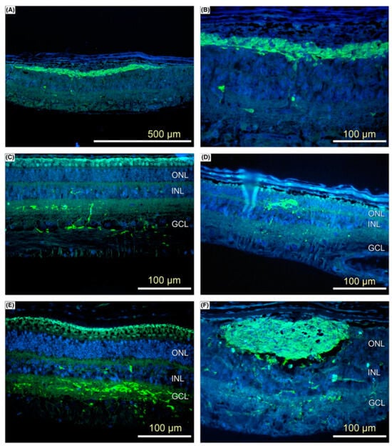 Photomicrographs of 5 μm retinal sections, captured at 3 weeks post-treatment, demonstrate the survival of implanted cells (green) at the 3-week time point (A–E). The green fluorescence indicates the presence of photoreceptor precursor cells (pRPCs), while the blue fluorescence represents Hoechst counterstaining for nuclear visualization. Additionally, images taken 24 h post-implantation (F) are included for comparative analysis. Reprinted from Ref. [].