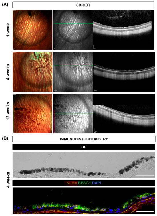 Subretinal engraftment of hESC-derived RPE cells in the albino rabbit model was evaluated through longitudinal multimodal imaging and histopathological analysis. (A) In vivo assessment utilizing multicolor confocal scanning laser ophthalmoscopy (cSLO) combined with spectral-domain optical coherence tomography (SD-OCT) demonstrated the structural integration of transplanted hESC-RPE cells at 1-, 4-, and 12-week postoperative intervals. The SD-OCT scan planes are demarcated by green reference lines. (B) Histological validation at the 4-week time point revealed successful RPE engraftment, as evidenced by bright-field microscopy and immunofluorescence staining for nuclear mitotic apparatus protein (NuMA) and bestrophin-1 (BEST-1), specific markers of RPE cellular integrity and functionality. Scale bars represent 200 μm for panel A and 50 μm for panel B. Reprinted from Ref. [].