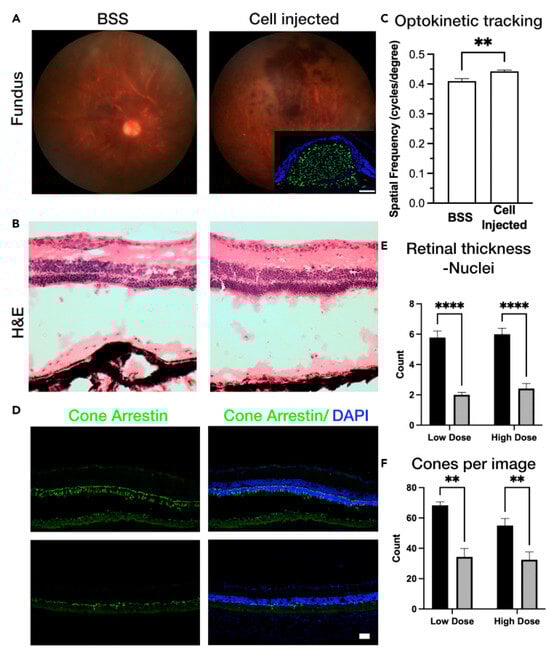 RPE cell transplantation in RCS rats. (A,B) Fundus imaging (A) and hematoxylin and eosin (H&E) staining (B) were performed on the eyes of RCS rats following subretinal injection of saline or retinal pigment epithelial (RPE) cells. The inset in (A) demonstrates the presence of human nuclear antigen-positive cells in the RPE-injected eye at postnatal day 90 (P90). (C) Assessment of visual function via optokinetic tracking revealed a significant improvement in visual acuity in RCS rats that received RPE transplantation compared to those injected with saline. (D) Immunohistochemical analysis of retinal sections using cone arrestin antibody was conducted to evaluate cone photoreceptor preservation following RPE transplantation. (E,F) Quantitative analysis of retinal thickness (E) and cone photoreceptor density (F) was performed in RCS rats receiving low and high doses of RPE transplantation. Measurements were taken from both the nasal and temporal regions of the retina. Scale bars represent 100 μm. Reprinted from Ref. [].