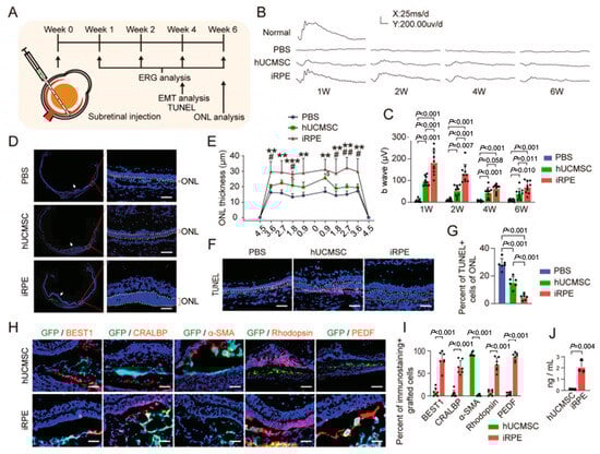 (A) Experimental design for the transplantation of induced retinal pigment epithelial (iRPE) cells in a sodium iodate (SI)-induced rat model of AMD. (B) ERG waveforms recorded at various time points post-transplantation. The calibration scale indicates 200 μV vertically and 25 ms horizontally. (C) Quantitative analysis of ERG b-wave amplitude (n = 10). Statistical significance was determined using one-way ANOVA followed by Bonferroni’s post hoc test. (D) Representative micrographs of retinal sections at 6 weeks post-transplantation. Injection sites are indicated by arrows, and the outer nuclear layer (ONL) is demarcated by yellow dashed lines. (E) Quantitative assessment of ONL thickness (μm) (n = 6). Statistical analysis was performed using one-way ANOVA with Bonferroni’s post hoc test. (F) Representative micrographs of retinal cryosections stained using the TUNEL assay to detect apoptotic cells. (G) Statistical analysis of the percentage of apoptotic cells within the ONL (n = 6). Data were analyzed using one-way ANOVA followed by Bonferroni’s post hoc test. (H) Immunostaining of human umbilical cord mesenchymal stem cells (hUCMSCs) and iRPE cells at 4 weeks post-transplantation in vivo. (I) Quantitative analysis of the percentage of immunostaining-positive grafted cells (n = 7). Statistical significance was determined using Student’s unpaired t-test. (J) Pigment epithelium-derived factor (PEDF) levels secreted by hUCMSCs and iRPE cells, as measured by ELISA (n = 4). Statistical analysis was performed using Student’s unpaired t-test. Scale bar = 50 μm. Data are presented as mean ± standard deviation (SD). Statistical significance is denoted as follows: ** p < 0.01, *** p < 0.001 compared to the PBS control group; # p < 0.05, ## p < 0.01 compared to the hUCMSC group; $ p < 0.05 compared to the PBS group. Adapted from Ref. [].