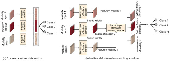 However, current approaches toward the early detection of skin lesions predominantly rely on the analysis of individual images [16,24]. This methodology presents constraints in the holistic examination of skin ailments. Our research circumvents this limitation by employing multi-modal imaging. Moreover, the prevailing trend in multi-modal methodologies mainly centers on the concatenation and fusion of distinct diagnostic modal features, often overlooking the intricate interplay between these modes and the critically important exchanges of multi-scale feature information [9,20,24]. To address this challenge, our study introduces a deep multi-modal information-switching network tailored for the end-to-end recognition of skin lesions. It harnesses the power of deep convolutional neural networks to elicit nuanced features specific to skin lesions across various skin image modalities. The network further augments the exchange of information between features from different modalities across multiple scales, thus ameliorating both the interpretability and recognition precision in multi-modal skin imaging for skin lesions. Figure 1 illustrates the distinction between our proposed method and traditional multi-modal classification models. Unlike conventional approaches that directly fuse the features extracted by the neural network, our method employs an information-switching module to exchange information between feature maps of different modalities at various scales. This enables the recognition model to better consider the relationships between modalities.