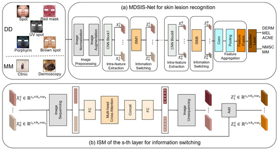 Figure 2 illustrates the holistic architecture of the MDSIS-Net (Figure 2a) network proposed in this study. The network comprises several key modules, including the image preprocessing module (Figure 2a), the multi-modal intra-feature extraction module (Figure 2a), the multi-modal information-switching module (ISM) (Figure 2b), and the feature aggregation module (Figure 2a). VISIA imaging is used to collect five modal images of patients with DD as input images. These modal images include spots, red marks, UV spots, porphyrins, and brown spots. MM images consist of two modalities of images: clinical images and dermoscopic images. The image preprocessing module is essential for refining input data through normalization and augmentation to guarantee optimal data quality and compatibility with the network. This study focuses on extracting meaningful features from different modalities in the input data through a multi-modal intra-feature extraction module. By leveraging multi-modal information, this module effectively captures diverse and complementary data, enhancing the network’s discriminative capabilities. To achieve this, we utilize the EfficientNetV2 block as the fundamental network module for multi-modal intra-feature extraction [34]. It consists of eight blocks, each producing feature maps at different scales, and employs shared parameters for handling multi-modal inputs. To enhance integration and information exchange across different modalities, a multi-modal ISM is integrated. This module strategically chooses and merges the most informative features from each modality, enabling effective information fusion and maximizing the synergistic advantages provided by multiple modalities. Additionally, it serves as an interactive platform for different modality features, enabling effective collaboration and exchange of information. The ISM further facilitates the exchange of information among the eight different scales of feature maps extracted by the EfficientNetV2. It ensures seamless communication and interaction between the feature maps at various scales, promoting effective information fusion and integration. Finally, the feature aggregation module consolidates the extracted features from different modalities into a unified representation. This comprehensive architecture enables the network to tackle the complexities of the given task and enhance its predictive capabilities. The model will be validated using the DD and MM datasets.