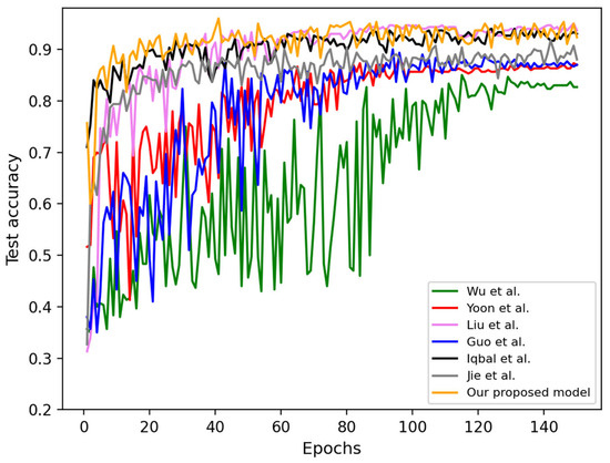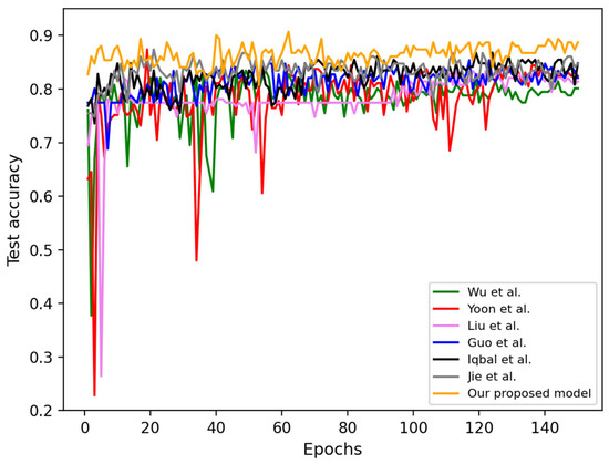 The test accuracy of several models on the DD dataset is shown in Figure 5. The orange curve corresponds to our proposed MDSIS-Net, which consistently outperforms other methods by achieving the highest convergence accuracy. This demonstrates the superior performance and efficacy of our MDSIS-Net model in accurately classifying DD in the dataset.
