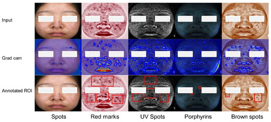 Figure 8 illustrates the Grad-CAM results of melasma, with the more prominent red and fluorescent areas indicating the severity of melasma. It is evident from the Grad-CAM images of the “red masks”, “UV spots”, and “brown spots” that the reflection of the melasma area is most pronounced. The appearance of some red spots in the Grad-CAM images indicates that patients with melasma also have an impaired skin barrier, while also showing that the pigment deposition area is larger than what is visible to the naked eye, signifying an advanced stage of melasma. The heatmap analysis aligns well with the diagnoses of dermatologists, further confirming the interpretability of the MDISB-Net model in identifying melasma. This interpretability enhances the trustworthiness and credibility of the MDISB-Net model in accurately identifying melasma.