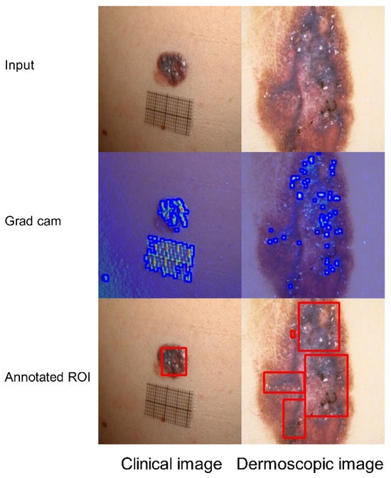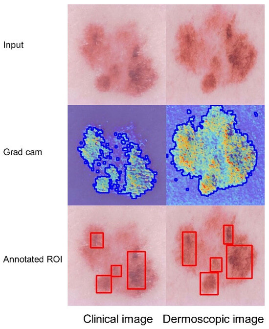 Figure 10 presents the Grad-CAM visualization of malignant melanoma (MM), with darker areas indicating the specific characteristics of MM. The clinical image Grad-CAM provides an overview of the overall characteristics of MM. In the dermoscopic image Grad-CAM, the darker areas reveal irregular pigment networks, while the redder areas highlight the presence of the blue-white curtain associated with MM. It is worth noting that an artificial object in Figure 10 is marked as a significant feature in the heatmap, which may be attributed to the similarity in visual patterns between the object and MM characteristics. Despite this, the heatmap analysis closely aligns with clinical assessments conducted by dermatologists. This can aid dermatologists in making more accurate diagnoses, optimizing treatment strategies, and improving care for patients managing MM.