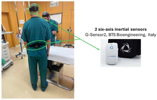 The trunk, head and neck posture of each surgeon was assessed by means of a simplified measurement set-up (shown in Figure 1) characterized by two commercially available 6-axis inertial measurement units (IMUs, 3-axes accelerometer combined with a 3-axes gyroscope, G-Sensor2, BTS Bioengineering, Milan, Italy), previously employed in similar studies [,]. One IMU was placed, using an anthropometrically adjustable semi-elastic belt, approximately in correspondence with the first lumbar vertebrae [] to quantify trunk posture (i.e., trunk flexion and lateral bending). The second IMU, placed at the back of the head [], was used to monitor head posture. Both IMUs were set to collect data onboard (at 50 Hz frequency) for the entire duration of the procedures, which typically was in the range 0.4–2.0 h.
