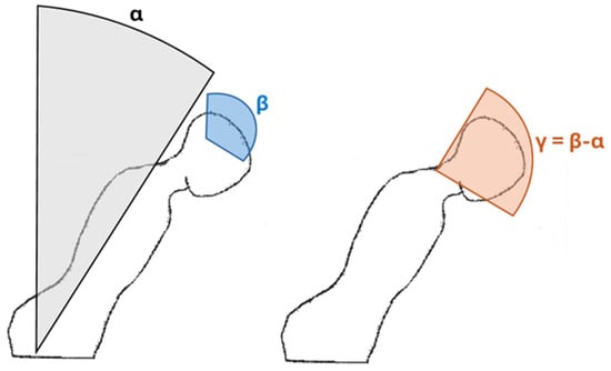 Representation of trunk (α, in gray) and head (β, in blue) flexion calculated from the two IMUs; neck flexion is indicated in orange and calculated as the difference between trunk and head flexion (γ = β − α). Adapted from ISO 11226.