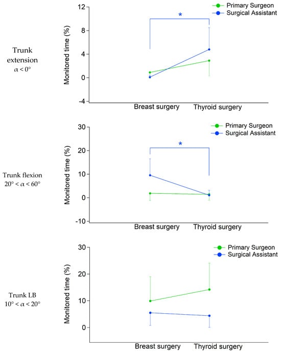 Generally speaking, our results indicated that surgeons spent most of the procedure time in static trunk posture, but rarely reached extreme flexions (i.e., >60°) and LBs (i.e., >20°). Nevertheless, during breast procedures, surgeons spent a higher percentage of time in flexion between 20° and 60°, compared to thyroid procedures (5.4% vs. 1.2%). Since previous studies suggested that excessive trunk flexion is associated with an increased risk of lower back disorders when trunk flexion exceeds 30° for more than 10% of the daily shift [], the values reported here do not seem of particular concern.