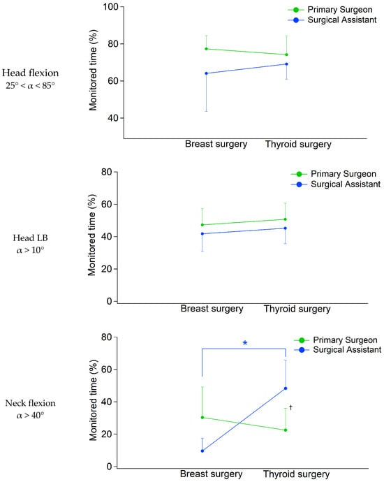 Average head flexion and LB among different surgeries and roles, following the classes of risk proposed by ISO 11226. Errors bars indicate SDs. The symbols * and † indicate, respectively, a significant difference between surgery groups within the same role and a significant main effect in the role × surgery interaction.